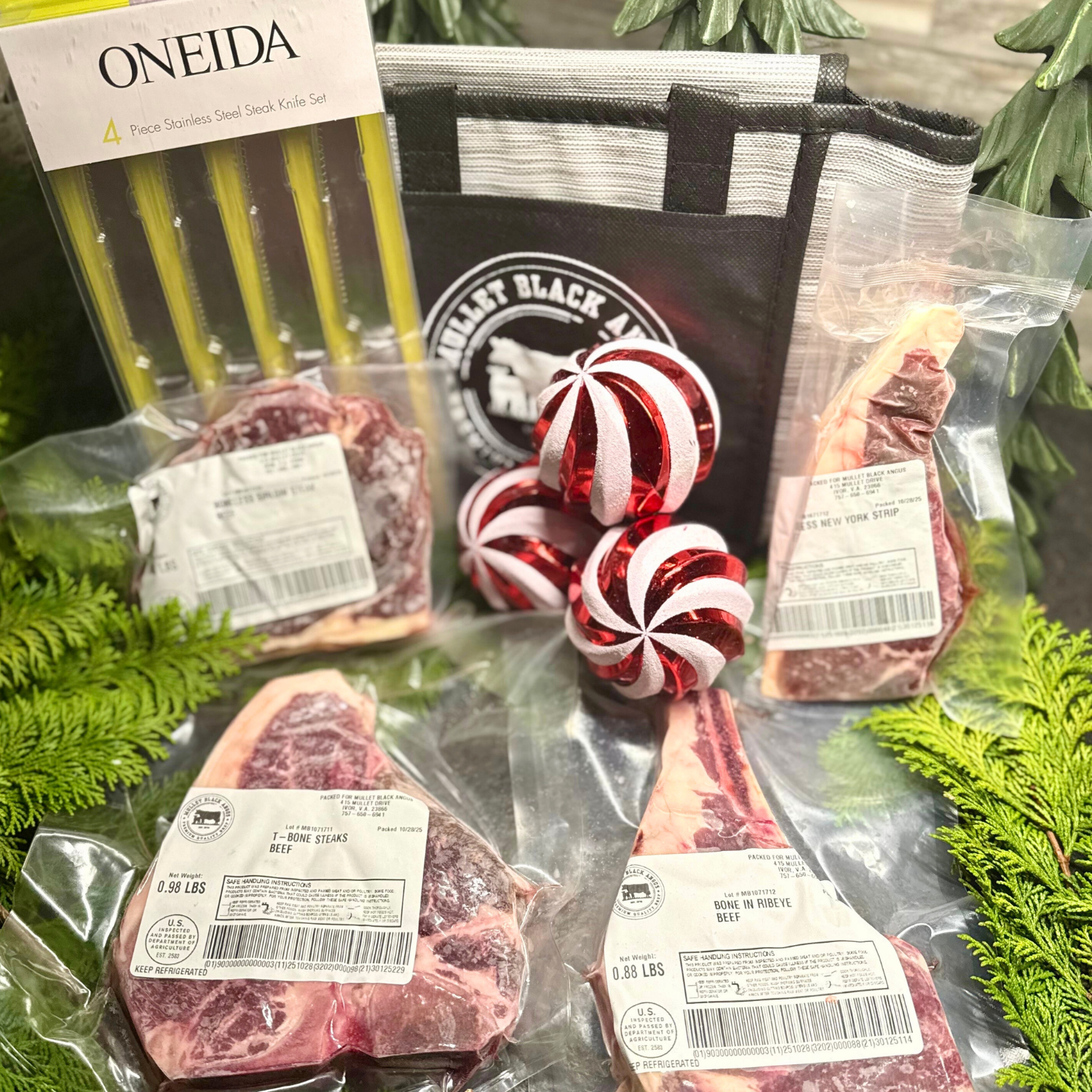 This bundle features 4 premium, grass-fed grain finished steaks — plus an insulated cooler + steak knives — making it the easiest (and most impressive) gift for the griller or meat-lover in your life.